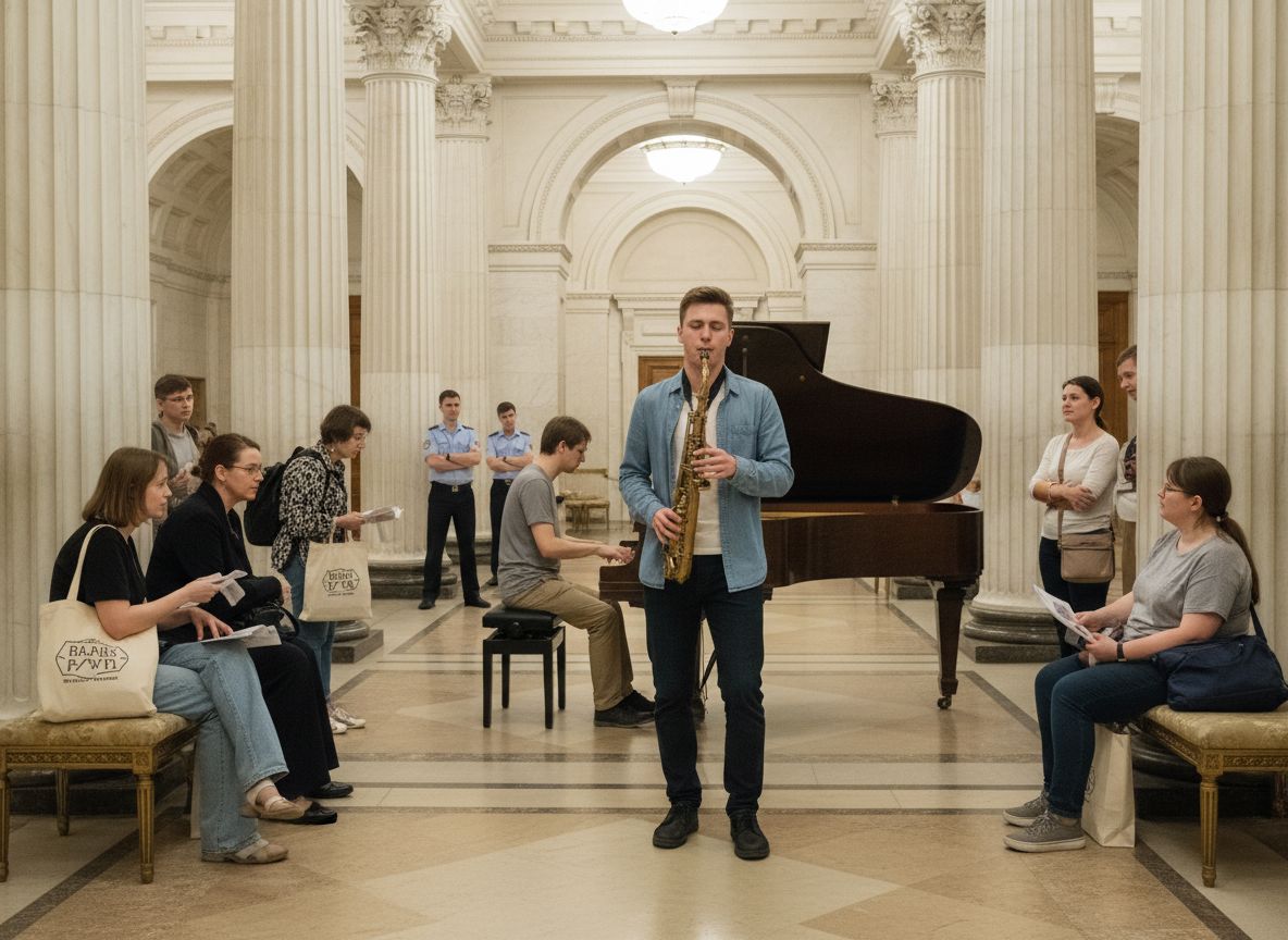 В городе М в эти выходные фойе филармонии временно сменило амплуа: вместо привычных очередей к гардеробу там устроят короткие дневные сеты молодых саксофонистов и пианистов. Вход свободный, но с условием — не занимать проход и не спорить с охраной, которая впервые в жизни будет слушать соло, а не шорох пакетов. Первый сет начнётся в 15:00, дальше по расписанию «кто успел — тот и сыграл».