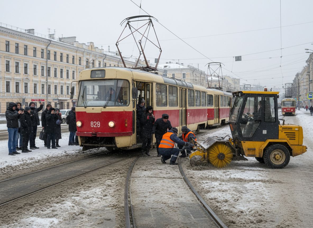 На месте работали аварийщики и трактор с щёткой, вокруг — привычная для «плана буран» городская хореография: кто-то снимает на телефон, кто-то спорит, где «нормально чистят», а кто-то просто ищет ближайший кофе. По словам мастера службы путей, «стрелки обмерзают быстро, если снег мокрый», и сегодня как раз такой случай. В диспетчерской напомнили, что при «плане буран» интервалы могут плавать.